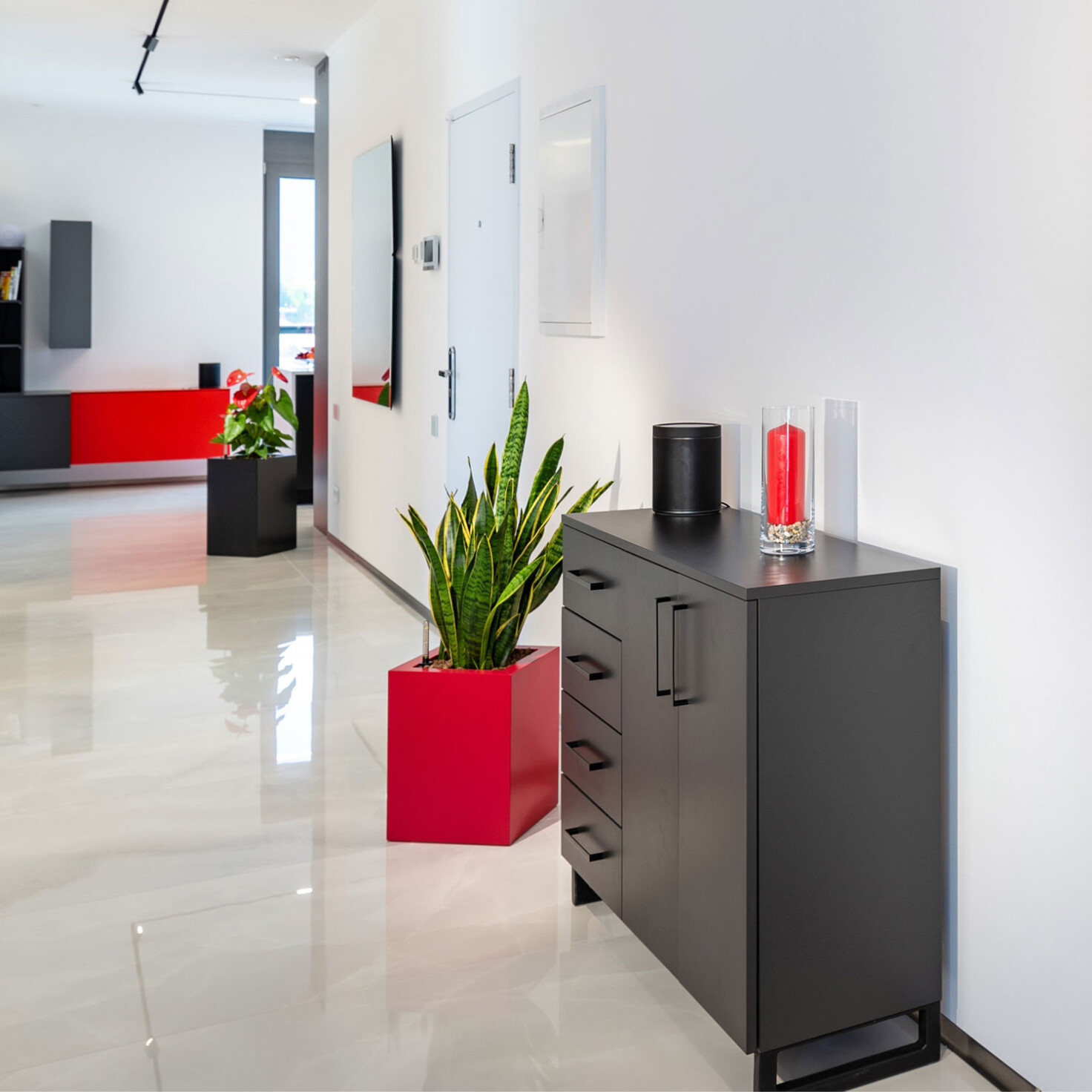 V byte pokračuje kombinácia antracitovej, červenej a šedej farby. Kde tu je doplnená bielou farbou na odľahčenie. Ukážka doplnkových skriniek, ako ďalšieho úložného priestoru, ktoré rozhodne nenudia. Rôzne rozmery, farby a inakosť koncepcie.